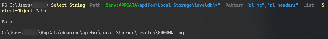 Select-String -Path "$env:APPDATA\apifox\Local Storage\leveldb\*" -Pattern "rl_mc","rl_headers" -List | Select-Object Path