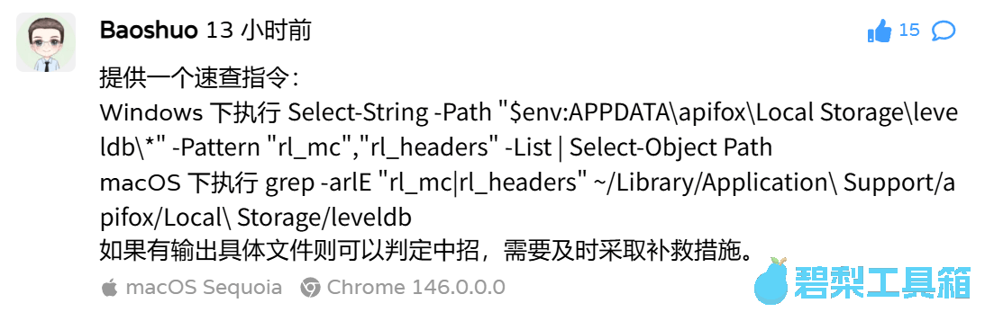 @白帽酱 在报告中提示,无论是否发现异常,只要你在风险时间段内使用过 Apifox SaaS 桌面客户端,务必按照 “已失陷” 的最高级别完成以下处置,切勿抱有侥幸心理: